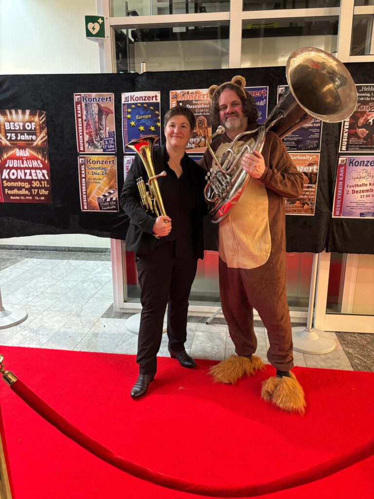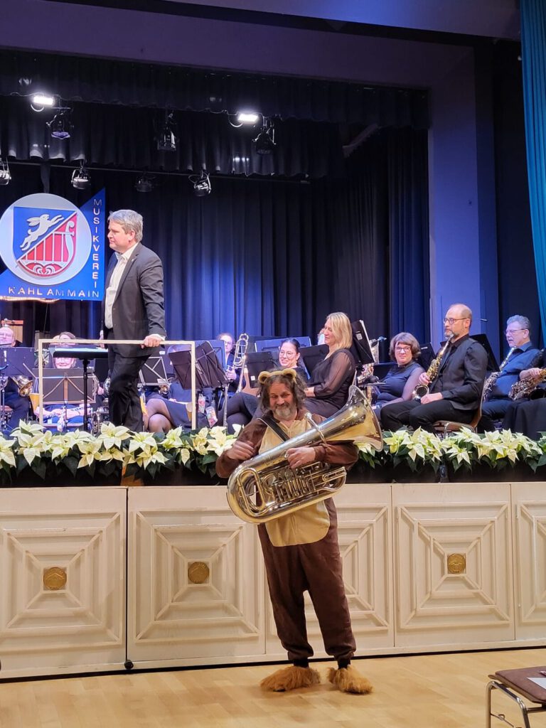Für einen besonderen Unterhaltungsakzent sorgte anschließend Tubist Dieter Duzak im Disney-Klassiker „Das Dschungelbuch“: In der Rolle des „Bären Balu“ intonierte er „Probier’s mal mit Gemütlichkeit“, während Dirigent sowie Musikerinnen und Musiker augenzwinkernd mit Cocktails überrascht wurden.